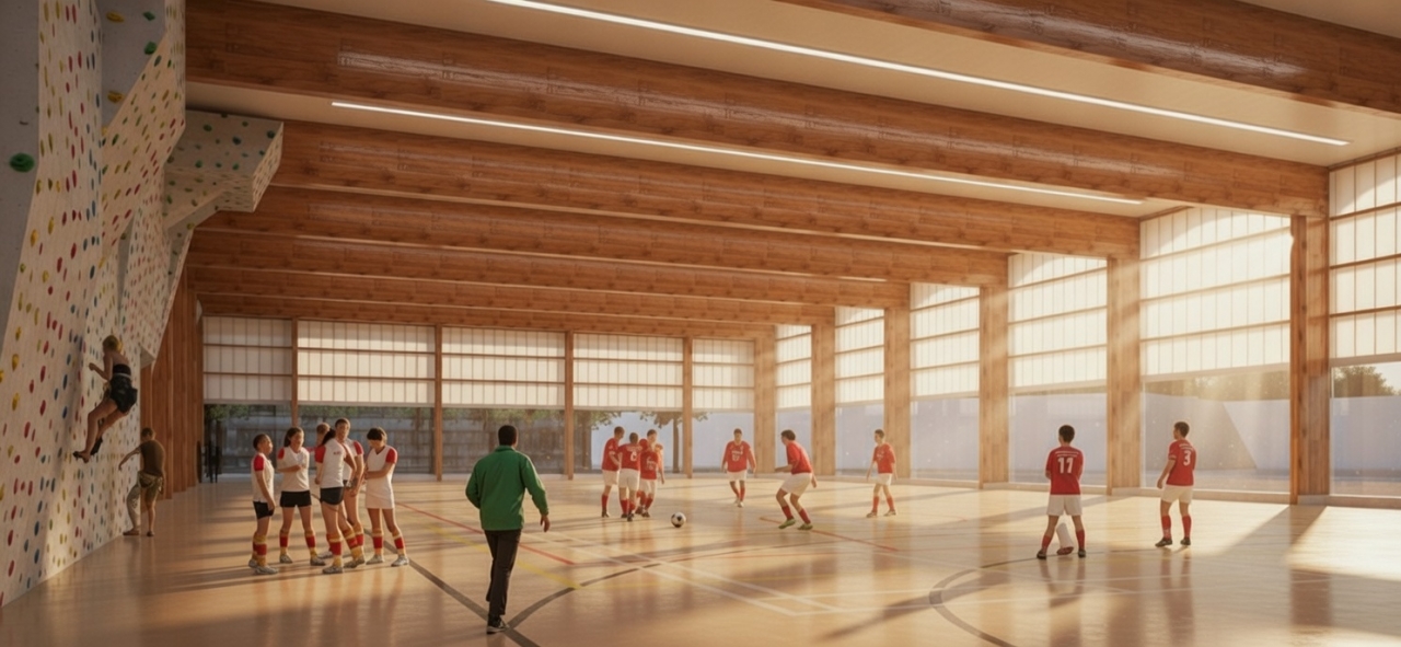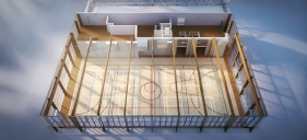 Door een verdiepinghoog venster is deze tribunetrap vanuit de Campuslaan te zien. Aan de andere entree van de Campus vormt de nieuwe sporthal een beeldmerk met een groot virtueel billboard, waar de hogeschool zich zou kunnen profileren. Ons ontwerp kreeg het predicaat Laureaat. “Het is een goed doordacht concept dat in grote lijnen past binnen het masterplan.” Jury Vlaams Bouwmeester en Hogeschool Gent |